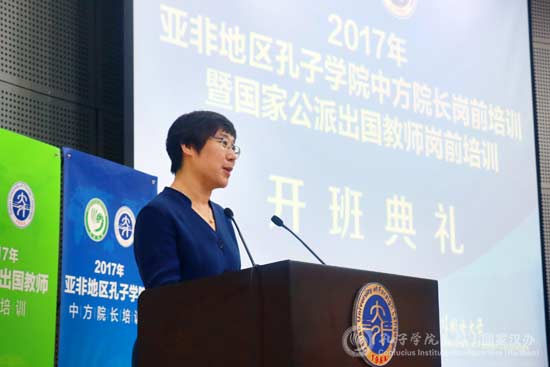 刘宏代表大连外国语大学向参训院长和老师的到来表示热烈欢迎。她表示,大连外国语大学十年间建了十所孔子学院,成功承办了27期院长、师资、志愿者培训,为孔子学院建设和汉语国际推广做出了贡献。十三五期间,学校将着重加强孔院院长队伍建设,为师资和志愿者队伍提供可持续人才保障,设置服务于汉推事业的科研和人才培养课题,开发特色教材,加强外派院长、教师管理以及制度建设,形成鼓励院长和教师主动积极奉献海外国际汉语推广的科研、评职、工资待遇等。她指出,在新的时代背景下, “一带一路”强调的共商、共建、共享理念,为孔子学院未来发展提供了崭新的动力和更加艰巨的任务。传播丝路文化、讲好丝路故事、阐明丝路精神,也将成为包括亚非国家在内的沿线国家孔子学院的新使命。