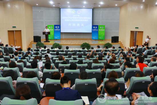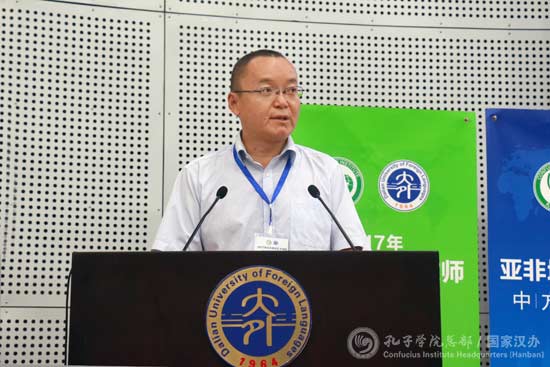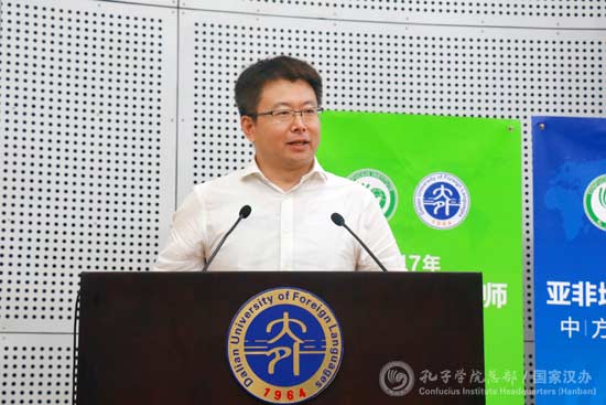 7月17日,2017年365bet365官网亚非孔子学院中方院长岗前培训和国家公派出国教师岗前培训开班仪式在大连外国语大学举行。来自38所中方院校的46位亚非孔院候任院长,以及121位拟赴英国和大洋洲任教的公派教师参加培训。大连外国语大学校长刘宏、国家汉办副主任夏建辉出席活动并致辞,新疆师范大学安德源和清华大学王阳分别代表参训中方院长和公派教师发言。