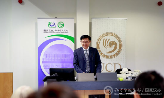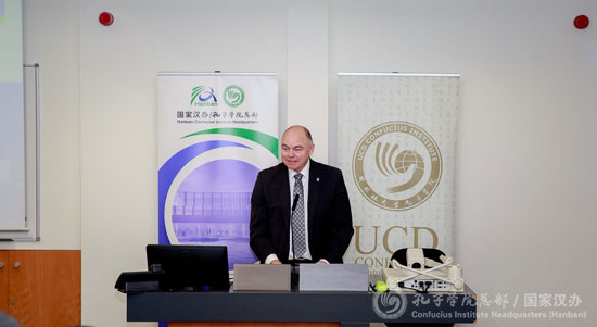 都柏林大学校长安德鲁?迪克斯致欢迎辞。他说,都柏林大学孔子学院自2006年成立以来,积极推动中爱教育、文化、商务和学术机构之间的合作,为开拓和深化两国友好关系做出了积极贡献。经过11年努力,孔子学院在学员规模、办学质量以及影响力上都取得了突出成绩,成为都柏林大学国际化发展和多元文化校园的重要组成部分。在中爱两国政府的支持下,都柏林大学示范孔子学院大楼即将竣工,这不仅是孔子学院发展的里程碑,更是汉语教育在爱尔兰蓬勃发展的象征。