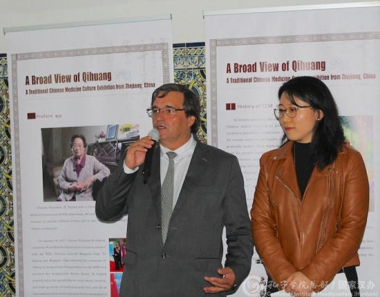4月6日,“岐黄博览——中国浙江中医药文化展”开幕式在葡萄牙知名高等学府科英布拉大学举行,科英布拉大学副校长Joaquim Carvalho、浙江中医药大学副校长郭清、北京第二外国语学院副校长朱佩芬、葡萄牙传统医学院执行院长Frederico Carvalho、里斯本中文学校校长陈晓红等近百名中外嘉宾参加开幕式,并随后在科英布拉大学科学博物馆聆听了由浙江中医药大学第三临床医学院副院长、主任中医师高宏主讲的“针灸疗法的传播与应用”专题学术报告。