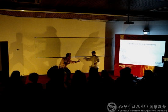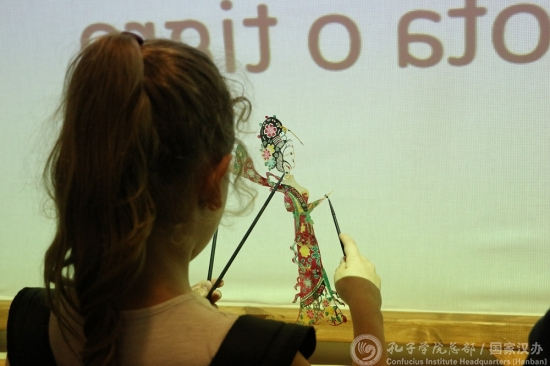 在皮影剧活动中,学生们观看了《武松打虎》的绘本和皮影戏。《武松打虎》是中国家喻户晓的故事,在“中国孩子的书香世界绘本展”中占有重要地位。而皮影戏则是中国传统民间艺术。在皮影戏中,孔子学院工作人员将中国武术元素植入表演之中,武术队的两名队员扮演武松和老虎,将二者的搏斗部分以武术的形式展现,自创了一部让观众喝彩连连的《武松打虎》皮影剧。