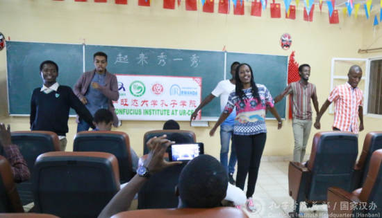 当地时间6月22日,卢旺达大学教育学院孔子学院假期营初级班(晚班)举行学习成果首场秀。初级班师生们欢聚一堂,奉上了唱中文歌、汉语对话、2分钟写汉字大比拼、跳健身舞、太极、娱乐游戏、太极扇、卢旺达歌舞等精彩表演。