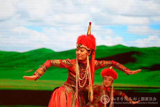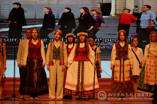 随后,各国学生和北外学生一起奉献了一场文艺演出。演员们独特的表现力和拉脱维亚籍主持人安泽高超的汉语水平博得现场观众的阵阵掌声。演出在《歌声与微笑》优美的旋律中徐徐落幕,一个个看似独立的节目早已在现场各国文化交融的氛围中互为映衬、相得益彰。