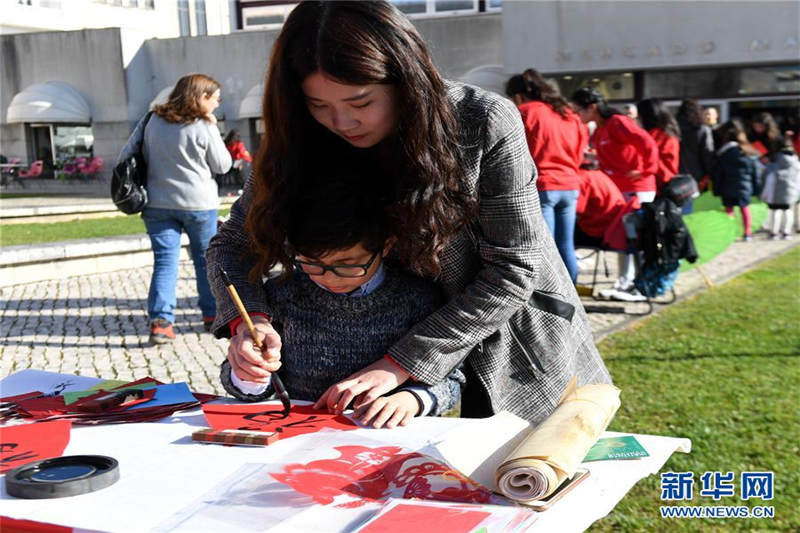 ????? 2月17日,在葡萄牙阿威罗市中心广场,阿威罗大学孔子学院的老师指导一名当地儿童练习中国书法。葡萄牙阿威罗大学孔子学院与阿威罗市政厅17日在市中心广场举行中国农历新年庆祝活动,吸引了千余市民参与。 新华社记者张立云摄