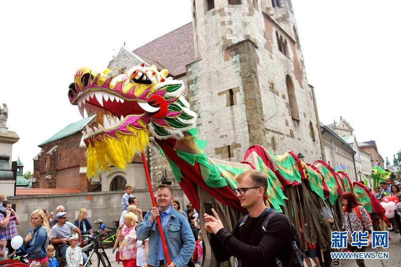 6月3日,在波兰克拉科夫,克拉科夫孔子学院携中国龙参加“游龙节”。当日,波兰南部城市克拉科夫举行“游龙节”。来自当地各个学校及其他文化机构的超过一千名青少年带着造型各异的“龙”参加巡游活动,其中克拉科夫孔子学院制作的“中国龙”十分引人注目。新华社记者石中玉摄