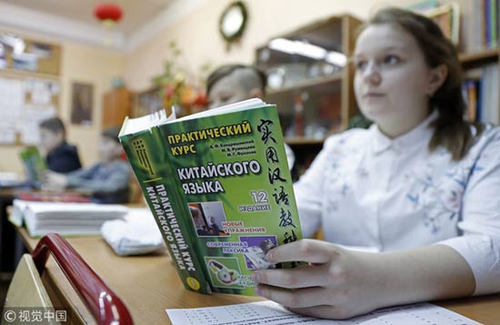 2017年12月14日,俄罗斯莫斯科,当地一所中学,学生们在课堂学习中文。(图片来源:视觉中国)