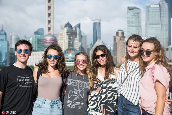 2018年7月10日,中国上海,一群外国留学生与外滩地标建筑合影。(图片来源:东方IC)