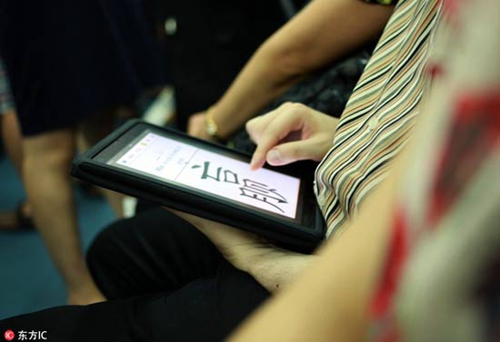 2012年7月4日,中国北京,一名外国乘客在平板电脑上练习汉字书法。(图片来源:东方IC)