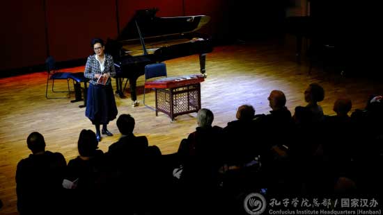 伴随着扬琴演奏曲《情思》,音乐会正式开始。演出上半场为观众带来纯正的中国音乐。《苏武牧羊》是东北扬琴流派的代表作品,著名演奏家于海英用娴熟的揉弦、颤竹、滑竹表现该流派的特点,也展示出苏武坚贞不屈的民族气节。笙是我国传统吹奏乐器,演奏家申玉晶用一首《飞鹤惊泉》塑造出一幅幅泉边飞鹤妙趣横生的画面,在座观众无不为此曲多变的节奏、流畅的旋律及复杂的技巧所惊叹。《阿细欢歌》取材云南民歌,音色饱满的笙与节奏明快的扬琴配合默契,仿佛把彝族阿细人节日里载歌载舞的热闹场面搬到了现场。