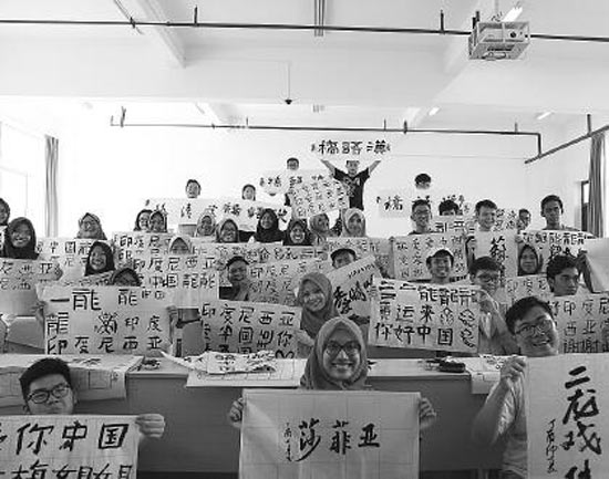东盟国家学生手持自己的作品和志愿者合影留念。