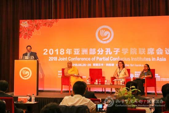 2018年6月27日下午,亚洲部分孔子学院联席会议在斯里兰卡科伦坡召开,阿富汗、巴基斯坦、孟加拉、尼泊尔、土耳其、伊朗、印度等8国23所孔院100余名代表出席会议。中国驻斯里兰卡大使馆代办庞春雪,斯里兰卡高等教育和文化部辅秘Madhawa Dewasurendra,孔子学院总部副总干事、国家汉办副主任郁云峰,科伦坡大学校长Lakshman Dissanayake,北京外国语大学副校长闫国华出席并致辞。斯里兰卡教育部辅秘Anuradha Wijekoon,凯拉尼亚大学常务副校长Lakshman Senevirantne,重庆师范大学副书记龚燕,红河学院副校长张灿邦等中外嘉宾也出席了开幕式。