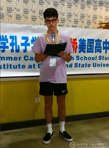在开营仪式上,四川师范大学国际教育学院副院长杨颖育对学生们的到来表示热情欢迎。来自布雷斯维尔-布罗德维(Brecksville-Broadview)高中的雷克瑞(Zachary Ravagnani)用汉语做了精彩的演讲,他表示这次夏令营是一个很好地了解中国文化的机会,希望能用新的视角去观察这个世界。随后,来自阿克伦STEM中学的9名学生带来了中文歌曲合唱《国家》,当地学校选派的学生志愿者代表也分别用中、英文发言。