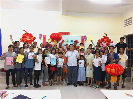 活动中,张芳瑜和郝丹丹老师给大家分发了彩笔、彩色卡纸和一些写有中国特色拜年祝福语的卡片,简要介绍了“身体健康”“万事如意”“狗年行大运”等祝福语的意思。之后,大家开始春节祝福语创作,学员们在绘画贴上认认真真地书写汉字祝福语和少量柬埔寨语并画上可爱的小狗等自己喜欢的图案。两位志愿者教师则从旁协助学生书写,为学生解疑答惑,希望通过书写和手绘这样的方式可以让学生了解更多有关中国春节的知识。