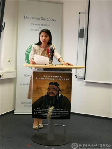 开场文艺表演后,杜塞尔多夫大学孔子学院外方院长培高德和山东省人民政府新闻办主任魏长民为尼山书屋揭牌。魏长民、中国驻杜塞尔多夫总领馆副总领事陶莉莉和培高德先后致辞。