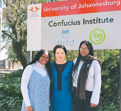 约翰内斯堡大学孔子学院中方院长彭奕(中)与两名非裔学生合影。
