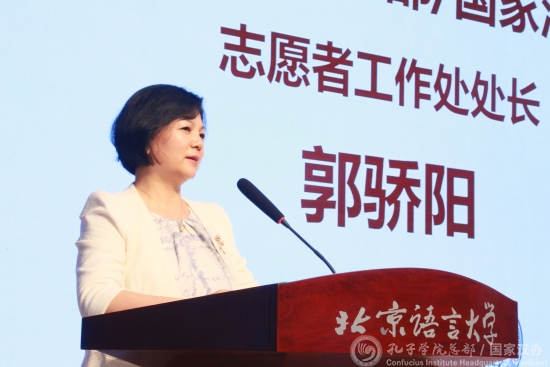 郭骄阳在在致辞中表示,感谢北京语言大学一直以来对孔子学院汉语教师志愿者培训的支持。她表示,志愿者们的光荣感、使命感、责任感值得学习,并鼓励志愿者们成为“有理性信念、有道德情操、有扎实的学识、有仁爱之心”的好教师。郭骄阳表示,希望此次培训能针对当前形势增加新的培训内容,也希望志愿者们在培训中,坚定理想信念,树立家国情怀,放眼世界,切实提升专业素养,同时严格遵守纪律,认真接受培训,争取成为合格的汉语教师志愿者,用青春开启人生新的征程。
